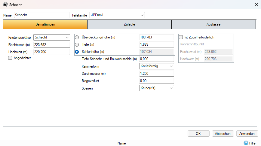 Sohlenhöhe: Stellt die Höhe (über Bezugspunkt) der Schachtbasis dar. Wenn eine Schacht- und Bauwerkssohle definiert ist, stellt sie die Höhe (über Bezugspunkt) der Unterkante der Schacht- und Bauwerkssohle dar.