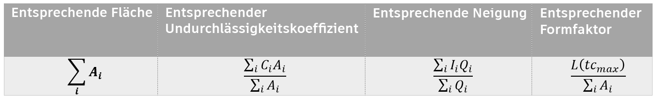 Der Hauptunterschied besteht darin, ob Einzugsgebiete seriell oder parallel gruppiert werden. Da Einzugsgebiete in InfoDrainage mit einer Verbindung oder einer Regenwassersteuerung (und nicht mit einem anderen Einzugsgebiet) verknüpft sind, ist in diesem Zusammenhang nur eine parallele Gruppierung sinnvoll. Die folgende Tabelle zeigt die Beziehungen, die zum Berechnen der entsprechenden Eigenschaften mehrerer gruppierter Einzugsgebiete verwendet werden.