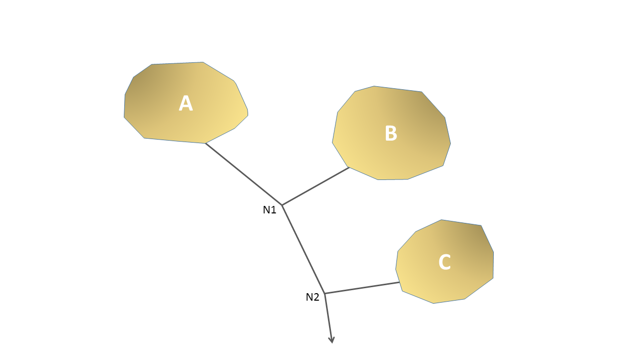 Betrachten wir als Beispiel das unten gezeigte vereinfachte Netz mit den drei Einzugsgebieten A, B und C. Am Netzstandort N1 wird der Spitzenvolumenstrom geschätzt, indem die Eigenschaften (über Parallelgruppierung //) von AB = A // B berechnet werden. Am Netzstandort N2 wird der Spitzenvolumenstrom durch Berechnung der Eigenschaften ABC = (AB) // C geschätzt.