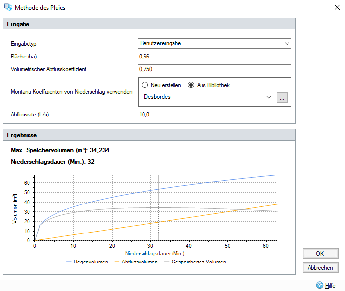 Sie bietet eine Möglichkeit, den Speicherbedarf auf Grundlage einer Zuflusskurve und einer festgelegten Abflussrate zu bestimmen. Der Zufluss wird anhand der Niederschlagsintensität bestimmt, die auf einer bestimmten Fläche (benutzerdefiniert oder aus dem Plan übernommen) auftrifft. Die Niederschlagsintensität wird von den Montana-Koeffizienten gemäß dem vom Benutzer angegebenen Desbordes-Niederschlag abgeleitet. Die Abflussrate ist eine konstante Rate, die vom Benutzer angegeben wird.