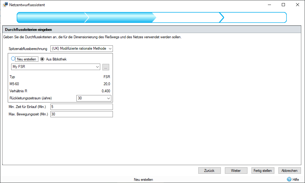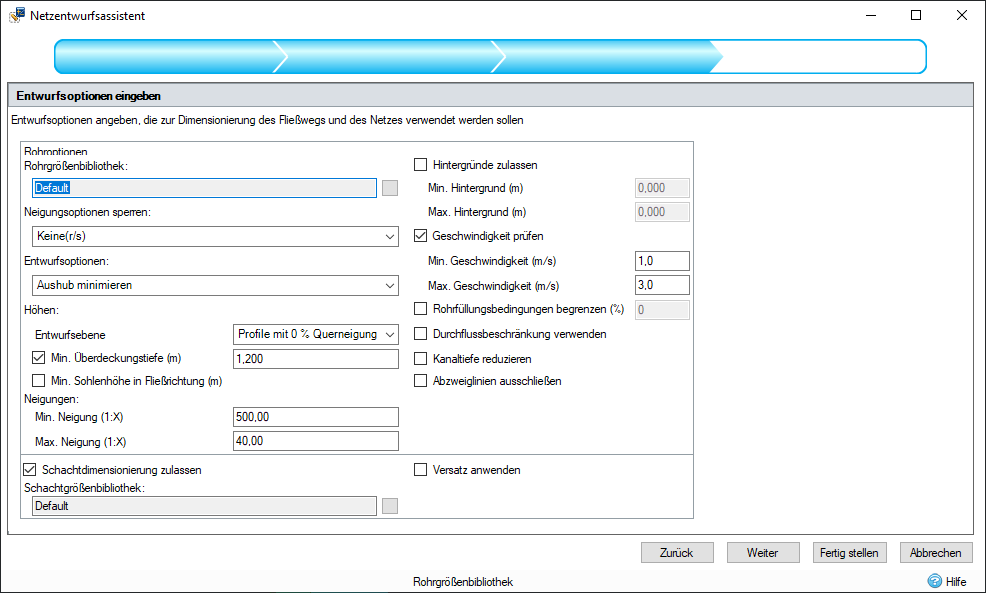 Der Netzentwurf erfolgt mithilfe des Netzentwurfsassistenten, mit dem Sie die Dimensionierung in einer Reihe von einfachen Schritten durchführen können, wie unten gezeigt. Die Ergebnisse des Netzentwurfs werden erst nach Abschluss des Assistenten angewendet. Der Benutzer kann den Vorgang jederzeit abbrechen, um die Änderungen zu verwerfen.