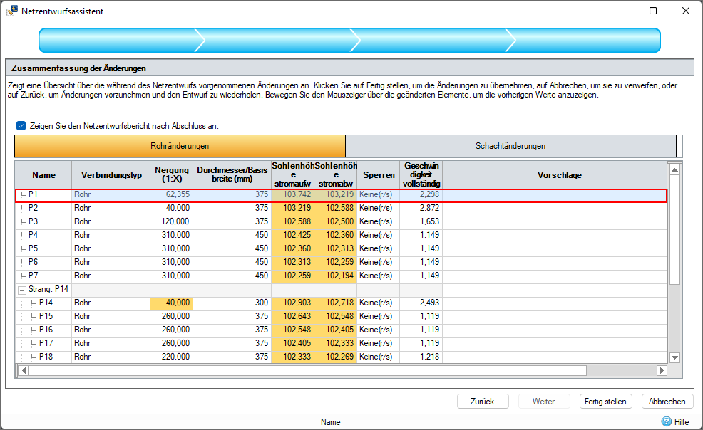 Von hier aus können die Änderungen entweder durch Klicken auf Abbrechen verworfen oder durch Klicken auf Fertigstellen akzeptiert werden. Sie können auch die Dimensionierung rückgängig machen, indem Sie auf Zurück klicken, sodass der Benutzer den Fließweg oder die Netzrichtlinien ändern kann. Nachdem der Benutzer auf Fertig stellen geklickt hat, wird je nach Status des entsprechenden Kontrollkästchens möglicherweise das Fenster Netzentwurfsbericht geöffnet.