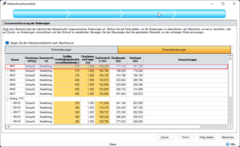 Zwei Registerkarten sind zu sehen: Rohränderungen zeigen die an den Rohren vorgenommenen Änderungen an und Schachtänderungen die an den Schächten vorgenommenen Änderungen.