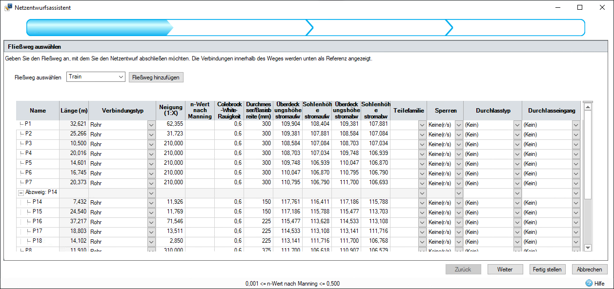 Hier können Sie mithilfe der Dropdown-Liste angeben, welchen Fließweg Sie dimensionieren möchten. Die Verbindungen innerhalb dieses Pfads werden in einer Tabelle angezeigt. Hier können letzte Bearbeitungen vorgenommen werden, bevor die Dimensionierung fortgesetzt wird.