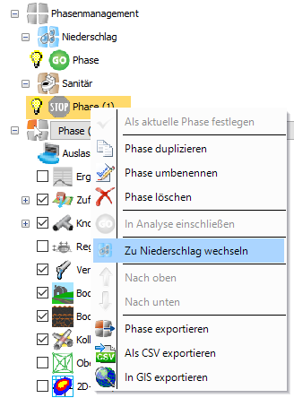Wenn Sie mit der rechten Maustaste auf eine Sanitärphase klicken, wird die Option Zu Niederschlag wechseln angezeigt.