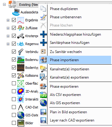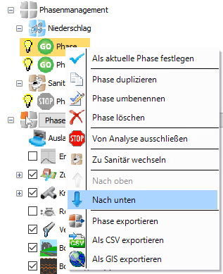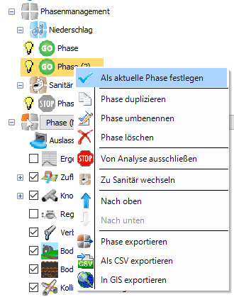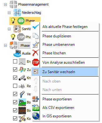 Es ist möglich, den Typ der Phase zu wechseln. Wenn Sie mit der rechten Maustaste auf eine Niederschlagsphase klicken, wird die Option Zu Sanitär wechseln angezeigt.
