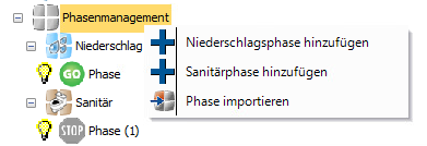 Wenn Sie mit der rechten Maustaste auf Phasenmanagement klicken, wird ein Menü angezeigt, das die Option Niederschlagsphase hinzufügen oder Sanitärphase hinzufügen enthält. Bei Auswahl dieser Option wird eine neue, leere Phase erstellt und in der Phasenauswahl zur Bearbeitung ausgewählt.