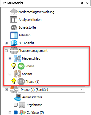 Die Option Phasenmanagement wird in der Strukturansicht unterhalb der Optionen auf Entwurfsebene und direkt vor der Phasenauswahl angezeigt. Dies bietet eine Schnellansicht der verfügbaren Phasen zusammen mit einem Bild, um anzugeben, ob sie analysiert werden oder nicht. Wenn Sie den Knoten erweitern, wird die Liste der verfügbaren Phasen angezeigt, die nach Phasentyp gruppiert sind (entweder Niederschlagsphase oder Sanitärphase).