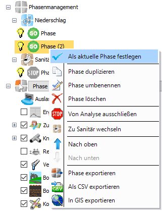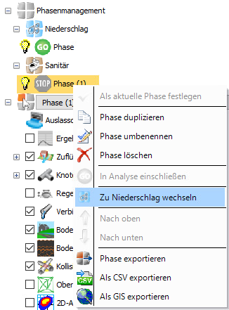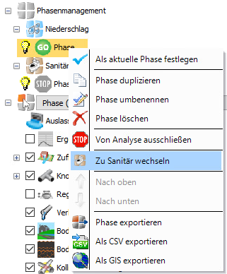 Es ist möglich, den Phasentyp in der Phasenauswahl zu wechseln. Wenn Sie mit der rechten Maustaste auf die aktuelle Phase klicken, wird die Option Zu Sanitär wechseln oder Zu Niederschlag wechseln angezeigt.