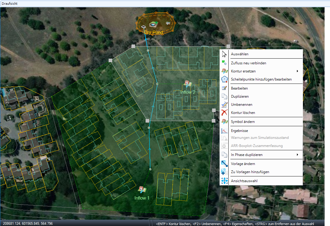 Am unteren Rand des Plans befinden sich Koordinaten und Hinweise. Der Abschnitt mit den Koordinaten zeigt die aktuelle Position des Mauszeigers in Weltkoordinaten an. Eine Höhe wird auch angezeigt, wenn ein TIN Oberflächendaten geladen wurde. Überschwemmungsergebnisse werden ebenfalls angegeben, wenn Daten verfügbar sind.