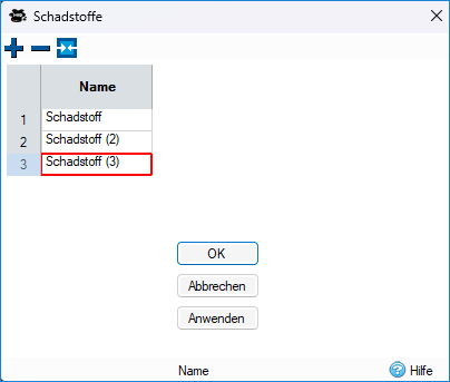 Hinzufügen: Fügt einen neuen Schadstoff am Ende der Liste hinzu.
