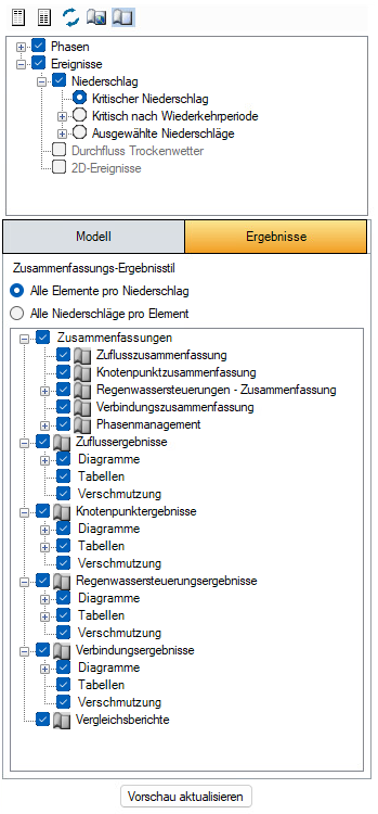 Die Registerkarte Ergebnisse ist nur verfügbar, wenn ausgewählte Phasen analysiert wurden. Die Ergebniselemente, die gedruckt werden können, sind die Ergebnisfunktionen Phasenmanagement, Zuflusszusammenfassung, Knotenpunktzusammenfassung, Regenwassersteuerungen – Zusammenfassung, Verbindungszusammenfassung, Zufluss – Elementergebnisse, Knotenpunkte – Elementergebnisse, Regenwassersteuerung – Elementergebnisse, Verbindung – Elementergebnisse und Vergleichsbericht.