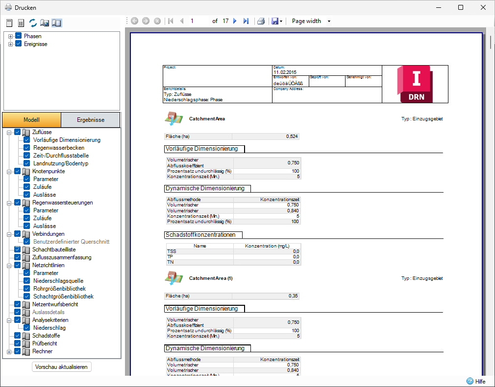 Die Modell- oder Domänenelemente, die gedruckt werden können, sind die Phasenobjekte Zuflüsse, Knotenpunkte , Regenwassersteuerungen (SWC), Verbindungen, Zuläufe und Auslässe. Andere Berichte, die einzeln angezeigt werden können, können auch in den GEDRUCKTEN Bericht aufgenommen werden. Diese sind Schachtbauteilliste, Zuflusszusammenfassung Netzrichtlinien, Netzentwurfsbericht, Auslaufdetails, Analysekriterien, Schadstoffe, Prüfbericht und Rechner.