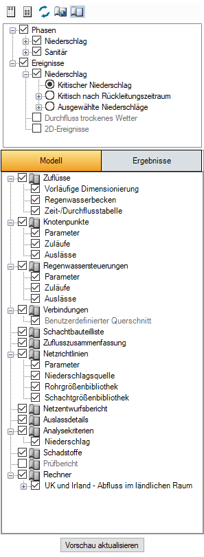 Verwenden Sie den Strang für Phasen, um auszuwählen, zu welchen Phasen und/oder einzelnen Fließwegen ein Bericht erstellt werden soll. Die Phasen sind nach Niederschlags- und Sanitärphase gruppiert.