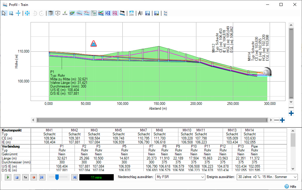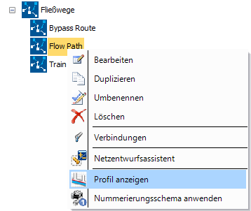 Um das Profil für einen bestimmten Fließweg anzuzeigen, doppelklicken Sie entweder in der Strukturansicht auf den Fließweg, oder klicken Sie mit der rechten Maustaste, und wählen Sie Profil anzeigen aus.