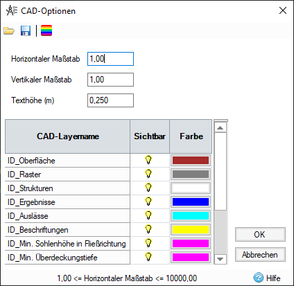 Das Formular CAD-Optionen wird zum Einrichten der CAD-Exportoptionen verwendet. Hier können Farben für jede Schicht sowie die HGL ausgewählt werden. Wenn nicht gewünscht, können Layer über die Glühbirnensymbole deaktiviert werden. Skalierungsfaktoren können sowohl für die horizontalen als auch für die vertikalen Achsen ausgewählt werden, und es kann eine Texthöhe angewendet werden, um sicherzustellen, dass der gesamte Text eine geeignete Höhe hat. Einstellungen können gespeichert und über die Symbole im Werkzeugkasten neu geladen werden. Der Werkzeugkasten enthält auch die Schaltfläche Zurücksetzen, mit der alle Farben und Einstellungen auf ihre Vorgabewerte zurückgesetzt werden können.