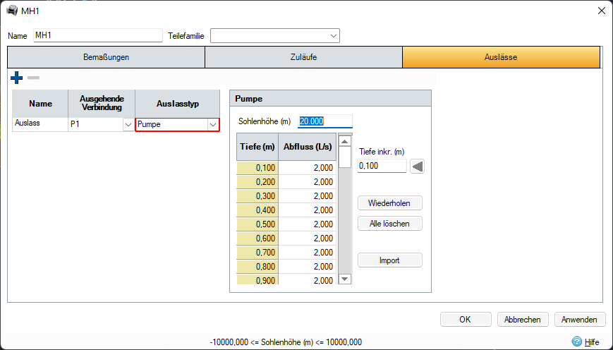 Alternativ können die Tiefen und Abflussraten manuell in die Tabelle eingegeben werden.