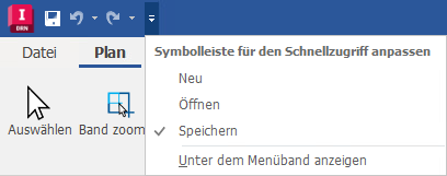 Dieses Dropdown-Menü enthält die Optionen Neu, Öffnen und Speichern Schnellzugriff und ermöglicht die Steuerung zum Ein-/Ausblenden von Multifunktionsleisten und der Position der Schnellzugriff-Werkzeugkasten.