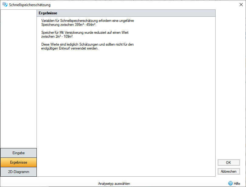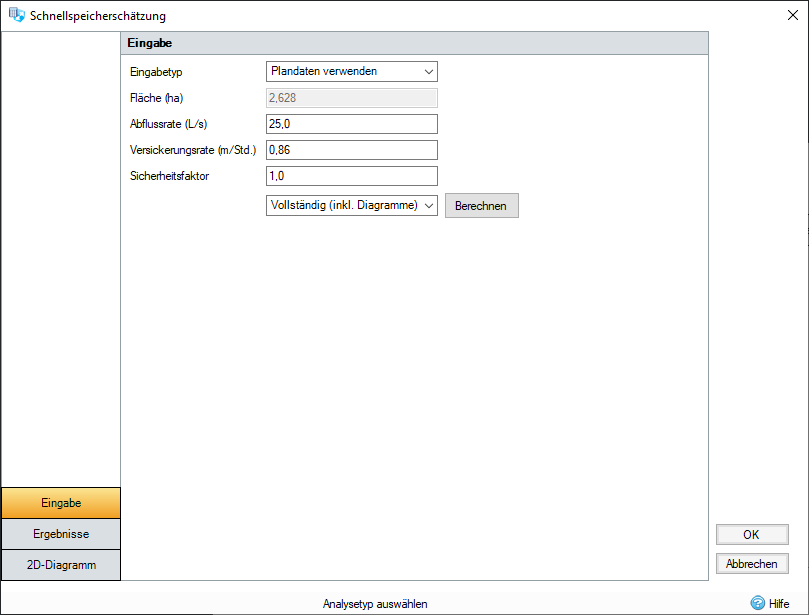 Schnell/Vollständig (inkl. Diagramme): Beide Optionen erzeugen eine Reihe von Ergebnissen mit und ohne Versickerung, die Option Vollständig erzeugt jedoch auch die 2D-Diagramme.