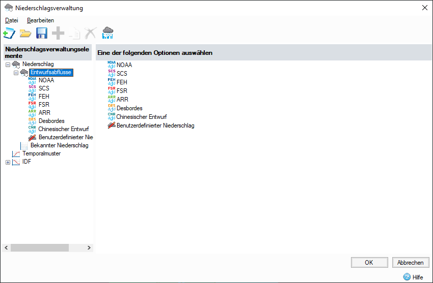 Der Niederschlagsverwaltung ermöglicht die Verwaltung von Niederschlagsdaten, einschließlich der Erstellung neuer Niederschläge, IDF-Profile oder Temporalmuster, die mit zuvor definierten Niederschlägen verwendet werden können. Benutzer können auch ganze Niederschlagssätze speichern und laden.