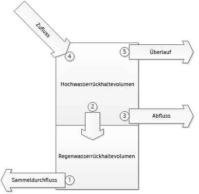 Beim Regenwasserbecken werden zwei unterschiedliche Volumen betrachtet. Das Regenrückhaltevolumen bietet einen Sammelvolumenstrom, bei dem es sich um einen konstanten Abfluss handelt, der bei der Analyse verloren geht. Das Hochwasserrückhaltevolumen bietet eine Regenwasserverminderung und einen Abfluss, der sich in der Analyse bis zum nächsten Knoten fortsetzt. Sämtlicher Überlauf wird ebenfalls an den nächsten Knoten weitergeleitet.