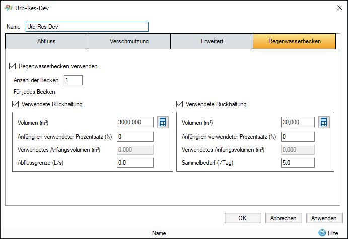 Wählen Sie die Option Regenwasserbecken verwenden aus, um die Variablen zu aktivieren und Details zum Regenwasserbecken anzugeben.