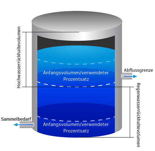 Verwendetes Anfangsvolumen: Zeigt das Volumen für den Hochwasserrückhalteteil des Beckens an, das zu Beginn der Analyse verwendet wird.