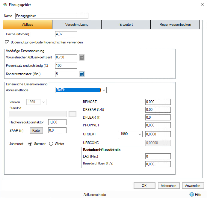 Basisvolumenstrom: Dieser Wert ersetzt den berechneten Basisvolumenstromwert, um einen benutzerdefinierten Basisvolumenstrom zu verwenden. Die Berechnung des Basisvolumenstroms kann durch Eingabe des Werts 0 deaktiviert werden. Dieser Wert sollte leer gelassen werden, damit die Software ihn berechnen kann. Beachten Sie, dass es sich bei Verwendung eines benutzerdefinierten Basisvolumenstroms um einen konstanten Basisvolumenstrom handelt, der sich nicht mit dem Niederschlag ändert.