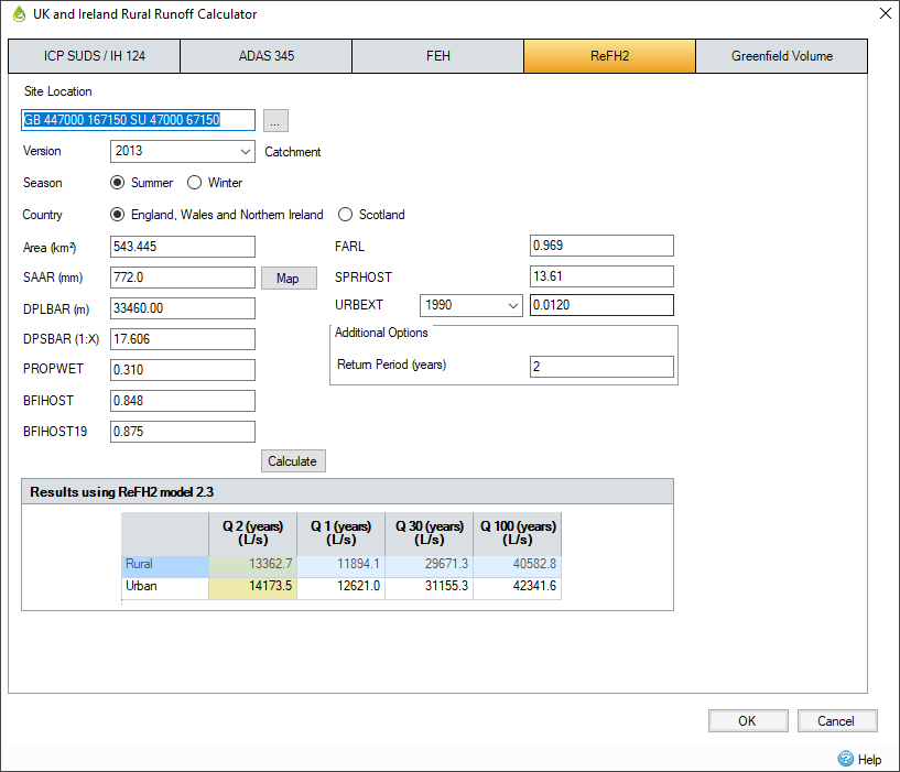 Die meisten dieser Werte im ReFH2-Rechner werden über die Bildschirmschaltfläche zum Importieren aus dem Webdienst, FEH-CD-ROM-Softwarepaket oder FEH-Webdienst importiert. Bei kleinen Einzugsgebieten ist es jedoch besonders wichtig, sie anhand einer Standortvermessung abzugleichen, um die Daten nach Möglichkeit zu prüfen.