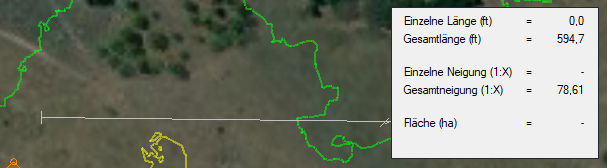 Um eine Länge oder Neigung zu messen, wählen Sie das Werkzeug Lineal aus, und klicken mit der linken Maustaste auf eine beliebige Stelle im Planfenster. Klicken Sie weiter mit der linken Maustaste, um Punkte hinzuzufügen, und klicken Sie mit der rechten Maustaste, um die aktuelle Linie zu beenden.