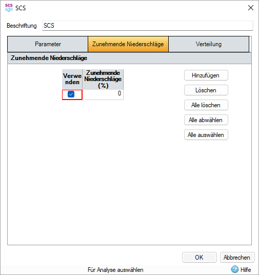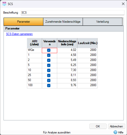 Verwenden Sie die unten beschriebenen Steuerelemente, um SCS-Niederschlag zu generieren, der von der Analyse durchgeführt werden soll.