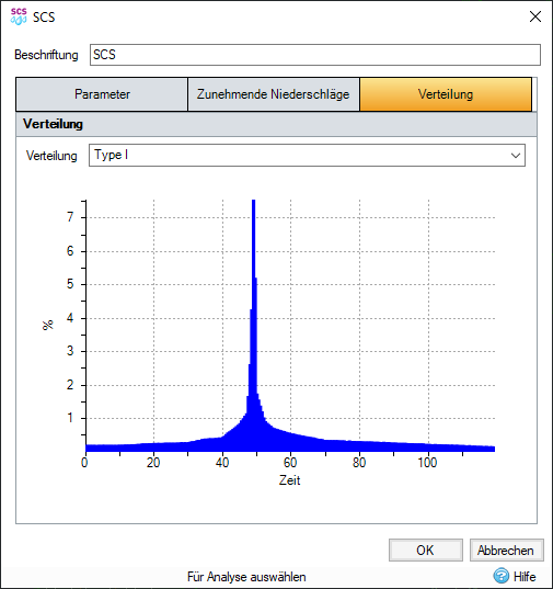 SCS-Hyetografen-Verteilungen vom Typ 1, 1A, 2 und 3 sind vorgabemäßig verfügbar und an denen in Anhang B des Technical Release 55 ausgerichtet. Wird ein anderer SCS-Hyetograf als dieser gewünscht, wird empfohlen, die Option für Entwurfsabflüsse (benutzerdefiniert) zu verwenden.