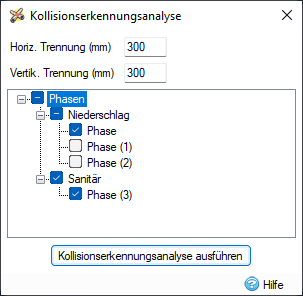 Phasen: Die Phasen des Entwurfs, die bei der Kollisionserkennung berücksichtigt werden sollen. Kollisionen werden auch dann erkannt, wenn Elemente gemeinsame Phasen aufweisen, sodass nur eine Phase erforderlich ist.