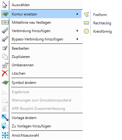 Regenwassersteuerungen können mit drei Arten von Konturen grafisch auf dem Plan gezeichnet werden. Kreisförmig, Rechteckig und Freiform. Beim ersten Hinzufügen einer Regenwassersteuerung zum Plan wird eine Vorgabekontur ausgewählt, die sich jedoch über das Kontextmenü ändern lässt.