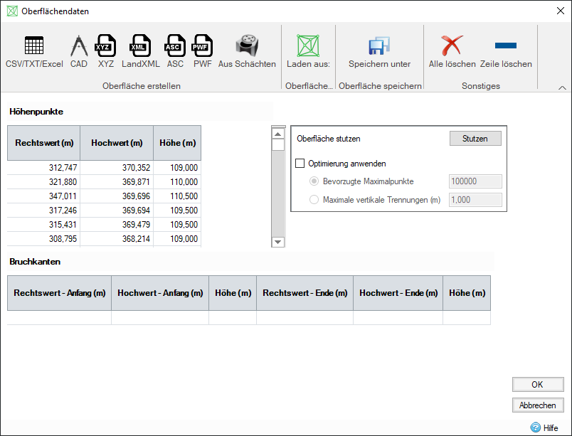 Nach dem Laden lassen sich die Daten bei Bedarf in den Tabellen im Formular anzeigen und bearbeiten. Wenn Sie auf OK klicken, führt die Software eine Triangulation durch und speichert die erstellte Oberflächendatei in einer IDSX-Datei, die dann von der aktuellen Phase referenziert wird. Diese Datei kann von mehreren verschiedenen Phasen innerhalb des Entwurfs referenziert werden, um Speicherplatz zu sparen, und bei Bedarf von anderen Entwürfen wiederverwendet werden.