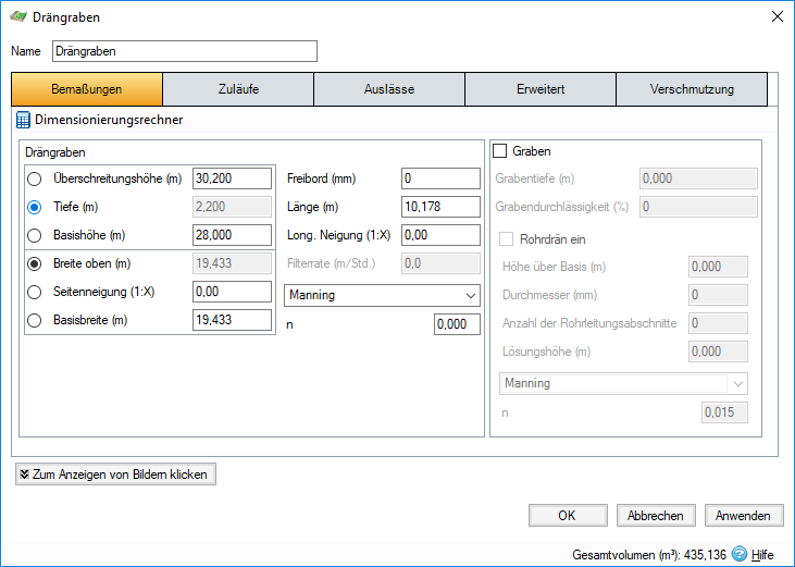 Die Querschnittsfläche des Drängrabenbereichs wird dann anhand der oberen Breite, der Seitenneigung und der Basisbreite bestimmt. Wenn gemäß der Tiefenberechnung zwei Werte angegeben sind, wird der dritte automatisch basierend auf der ausgewählten Option berechnet: