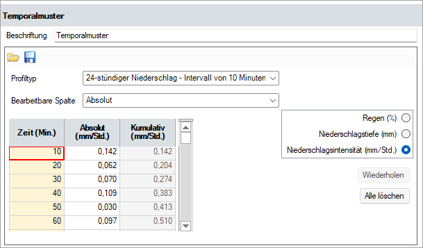 24-stündiger Niederschlag – Intervall von 10 Minuten: Ermöglicht die Eingabe von Informationen, um einen 24-stündigen Niederschlag in einem Intervall von 10 Minuten zu beschreiben. Anmerkung: Die zu erstellende Niederschlagsdauer ist auf 24 Stunden begrenzt.