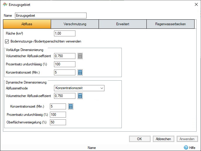 Oberflächenversiegelung: Damit wird die undurchlässige Fläche um den angegebenen Wert skaliert. Diese Option kann verwendet werden, um die Vergrößerung städtischer Gebiete oder andere Faktoren zu berücksichtigen. Der Wert wird nur aktiviert (und eingesetzt), wenn die Versiegelung für die Analyse in den Analysekriterien auf die Nutzung von Einzugsgebieten eingestellt ist.