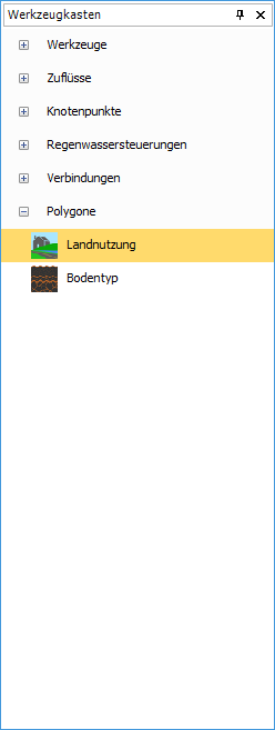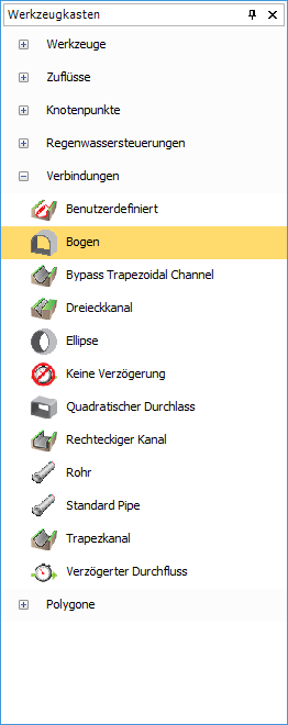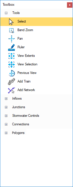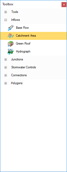 On the right-hand side of the screen we have the Toolbox which shows the functions and items that allow the creation of drainage schemes on the plan view. A default set of items are supplied with the software; additional items can be added through Object Templates.