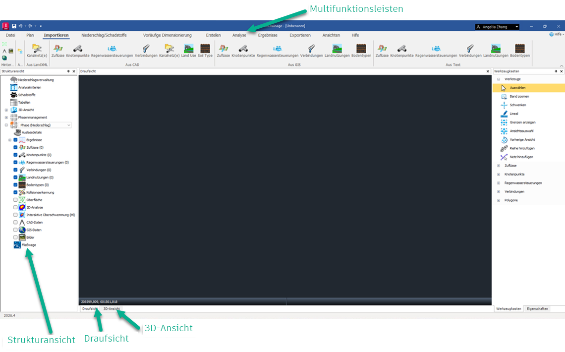 This is the main screen of InfoDrainage that is visible when creating and analyzing networks. The main parts are seen below: