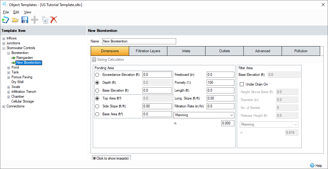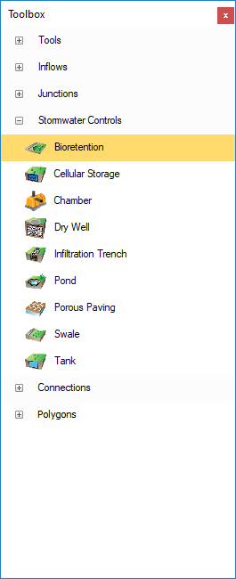 Within InfoDrainage, you can import, create, and export object templates that can be transferred to another computer with InfoDrainage installed. The template items then become available in the Build menu and the Toolbox. In this model, the Toolbox includes the default Template items, as well as Templates set up specifically for this tutorial. Once we have set up Stormwater Controls that comply with our local standards, we can add them to a Templates file by right-clicking an item and selecting Add to Templates. For more information about this topic, go to Object Templates.