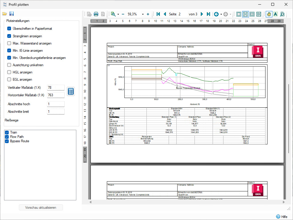 The Plot Profile tool allows you to preview all of the availableFlow Paths Profile and how they will be plotted. You can select the desired scales and output the plots to a printer for distribution. For more information about this topic, go to Plot Profile.