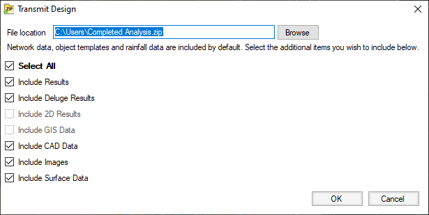 This allows the user to save a zip file with all the associated files together suitable for transferring to a colleague or client, or to the Innovyze Help Desk. The user can choose to include Results, CAD data, GIS data, Images or Surface Data. Network data and Rainfall data will be included by default. For more information about this topic, go to Transmit Design.