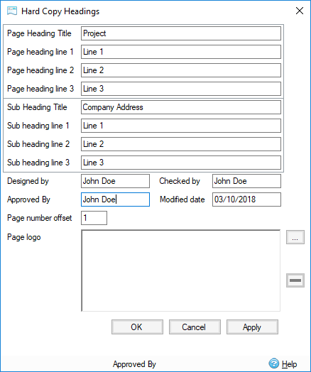 This is a very useful tool to include the name of the designer and checker and specify the headings which will be printed at the top of each printed page. A user defined logo can be added at the top of each page by browsing for an appropriate image file. For more information about this topic, go to Hard Copy Headings.