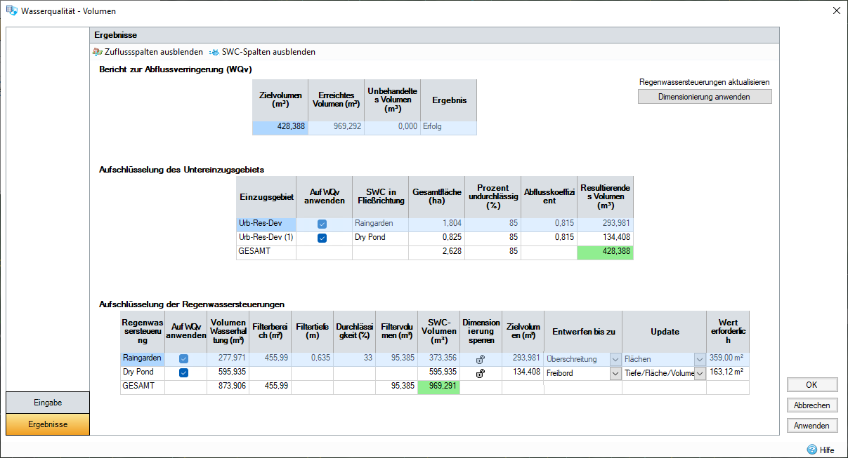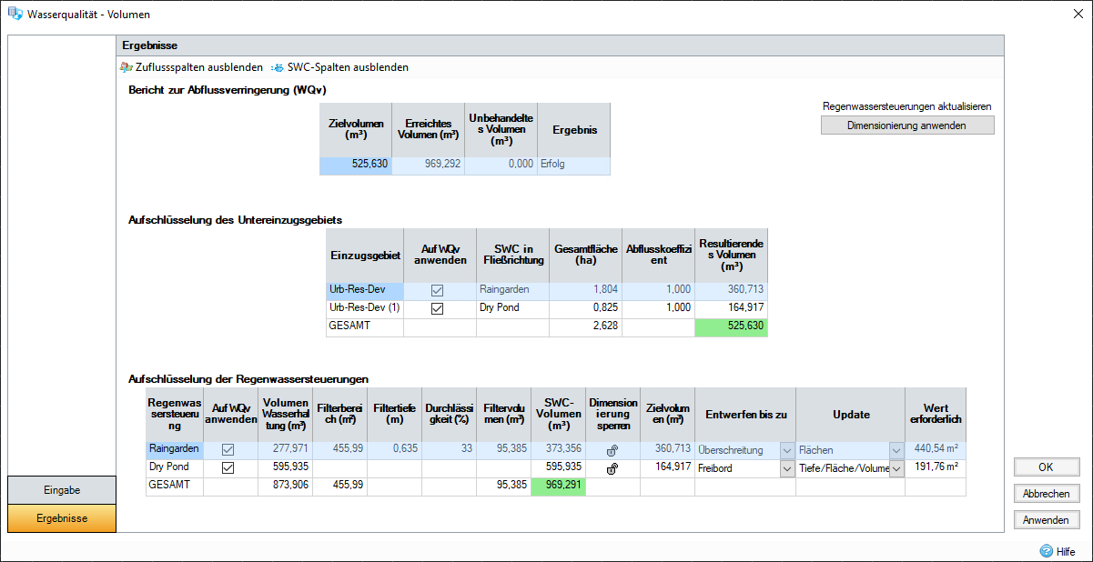 Auf WQv anwenden (nur globaler Modus): Ermöglicht es Ihnen, Regenwassersteuerungen in Berechnungen einzubeziehen oder daraus auszuschließen. Dadurch werden sie aus der Gesamtmenge des erreichten Volumens in der Zusammenfassungstabelle entfernt.