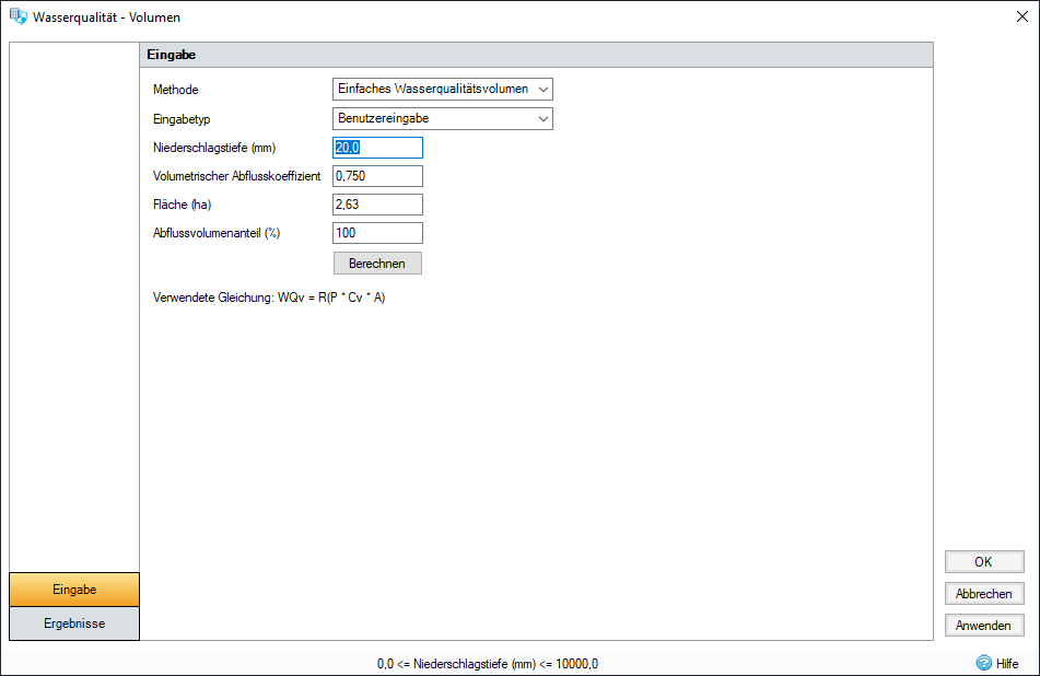 WQv = Wasserqualitätsvolumen / aufbereitbares Volumen P = Niederschlagstiefe Cv = Abflusskoeffizient A = Fläche R = Anteil des erforderlichen Abflussvolumen (Vorgabe ist 100 %)