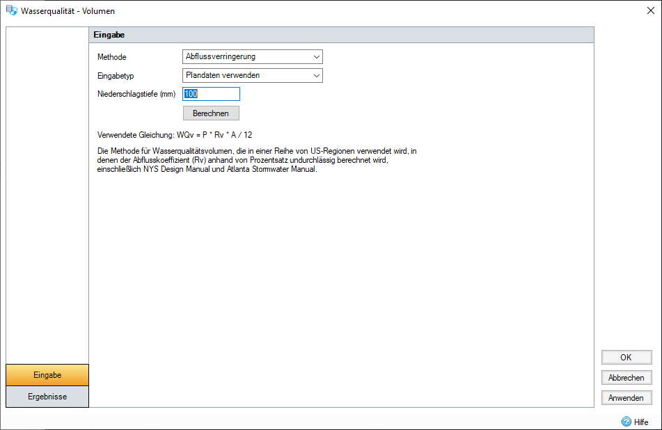 Der Rechner für Wasserqualität basiert auf zwei Methoden zur Berechnung des resultierenden Volumens. Die erste Methode ist eine Berechnung der einfachen Wasserqualität, die zweite ist die Berechnung der Wasserqualität im Hinblick auf die Abflussverringerung.