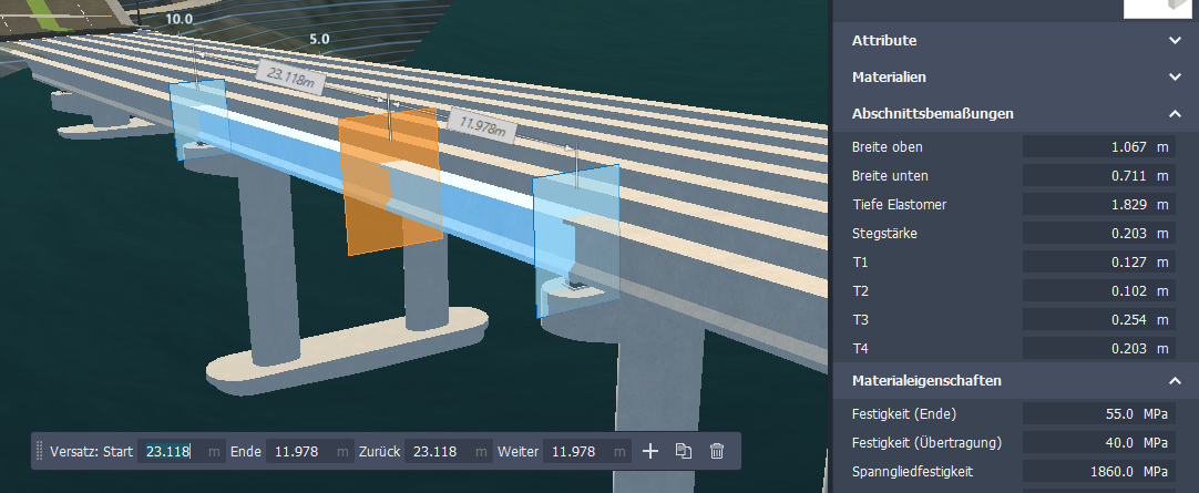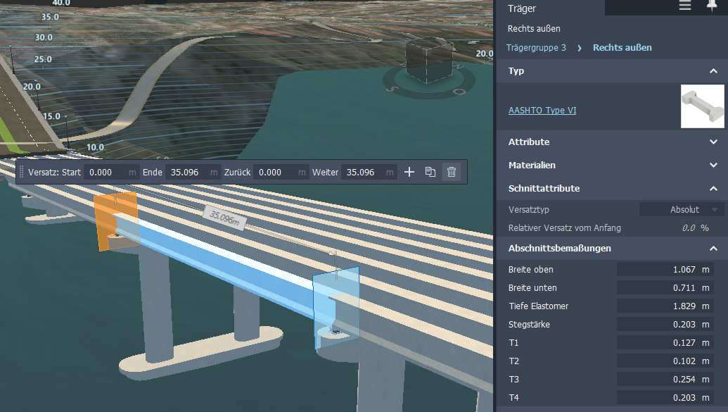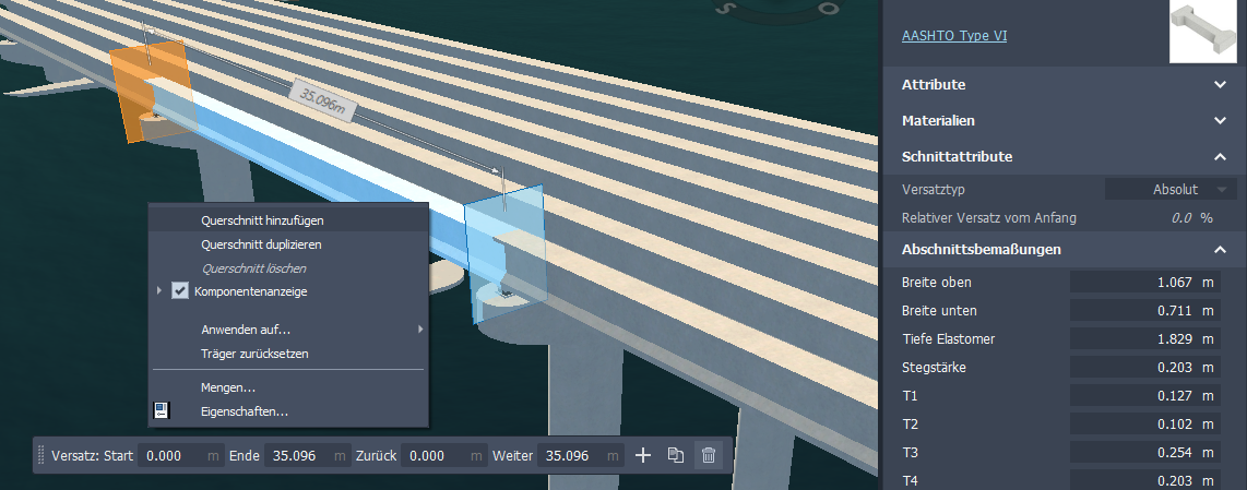 Überprüfen und ändern Sie Trägerquerschnitte, um die absolute oder relative Position der Trägerquerschnitte in der Brücke zu steuern, und ändern Sie die Trägerquerschnittsbemaßungen. Trägerquerschnitte können einem einzelnen Träger, einer Trägergruppe oder allen Brückenträgern hinzugefügt werden. Sie können Trägerquerschnitte auch duplizieren oder entfernen.