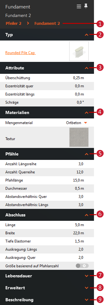 | | - Klicken Sie auf den Pfeilerfundament-Namen, um alle Pfeilerfundamente in der ausgewählten Brücke anzuzeigen, und/oder wählen Sie ein anderes Pfeilerfundament, mit dem Sie arbeiten möchten.
