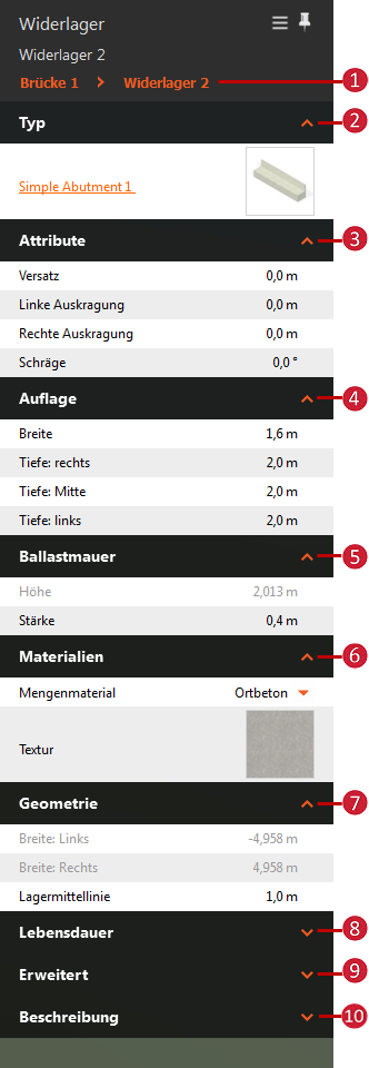 - Verfügbare Attribute variieren basierend auf dem Widerlagerkomponentenstil. Die meisten Attribute für das ausgewählte Widerlager sind im Stapel bearbeitbar.
